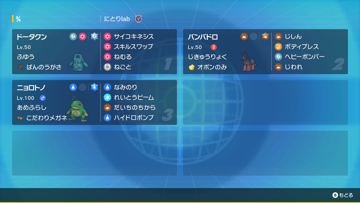アタッカーニョロトノや叩きグライオンなどには勝てないが、それ以外のテンプレ型なら多分勝てるようになってるはず。大会では1回滅びニョロトノを嵌めて降参を貰った。ニョロトノごめんね。