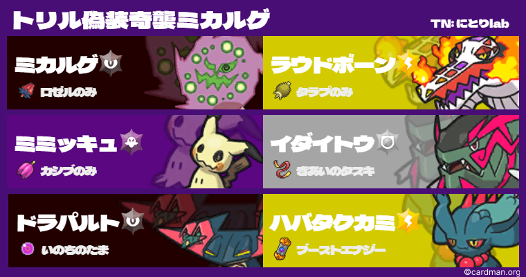 3.初手ミカルゲが得たアドを逃がさない対面駒として、ミカルゲと並べてトリル偽装もできるミミッキュ、イダイトウを採用。