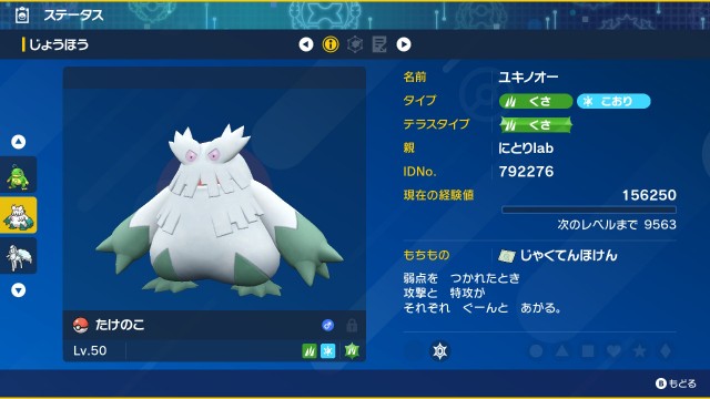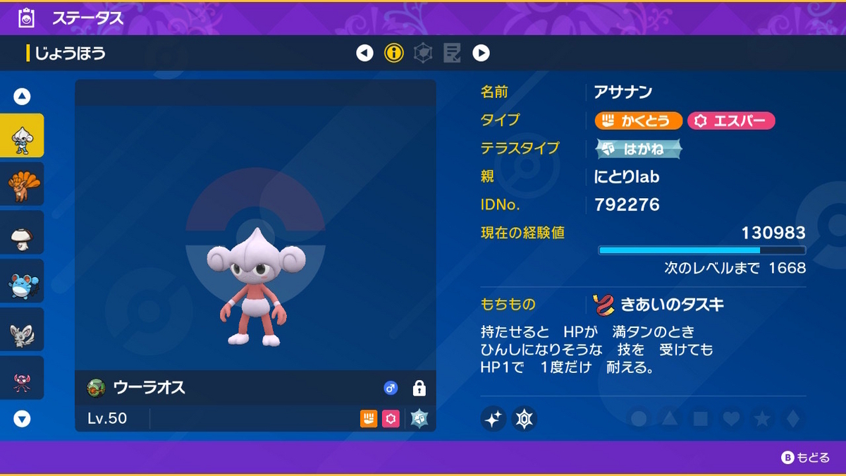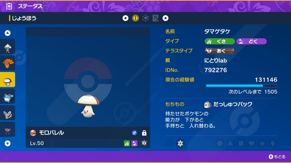 優秀クッション。先述のロコンと相性が良いのはもちろん、相手の毒菱回収や宿り木胞子の一貫切り、脱出による対面操作、無対策相手に強力な胞子催眠など偉い要素が沢山あります。テラスタイプは主にアサナンのエスパー技を意識して悪。